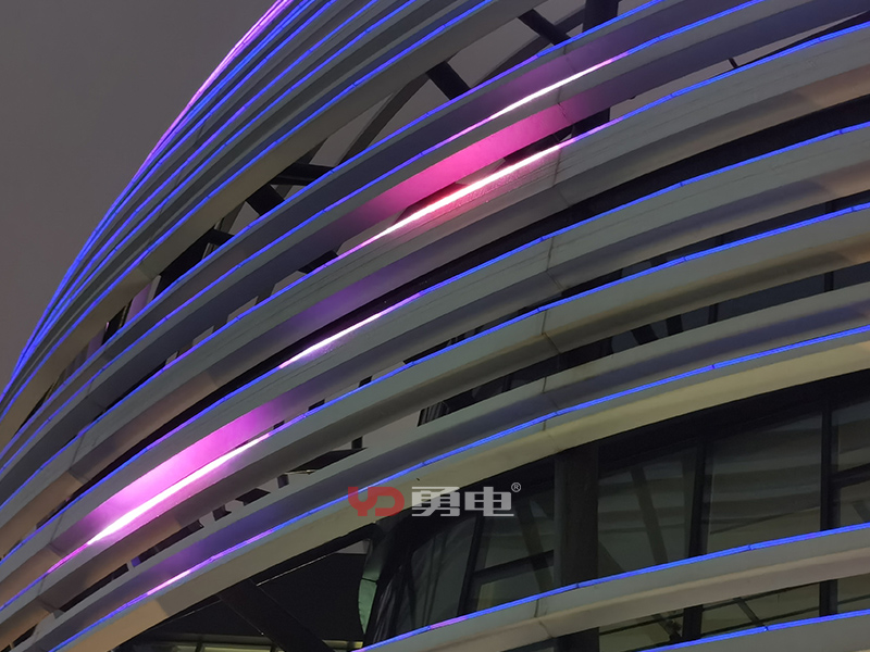 該項目照明主體為張江人工智能展廳,樓體外型充滿未來科技感,建筑樓高23米,樓周長185米,采用勇電二次封裝LED線條燈,用線強調(diào)建筑的輪廓,將環(huán)形立面刻畫出新形態(tài),豐富建筑肌理,讓建筑在夜間充滿活力!