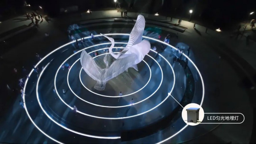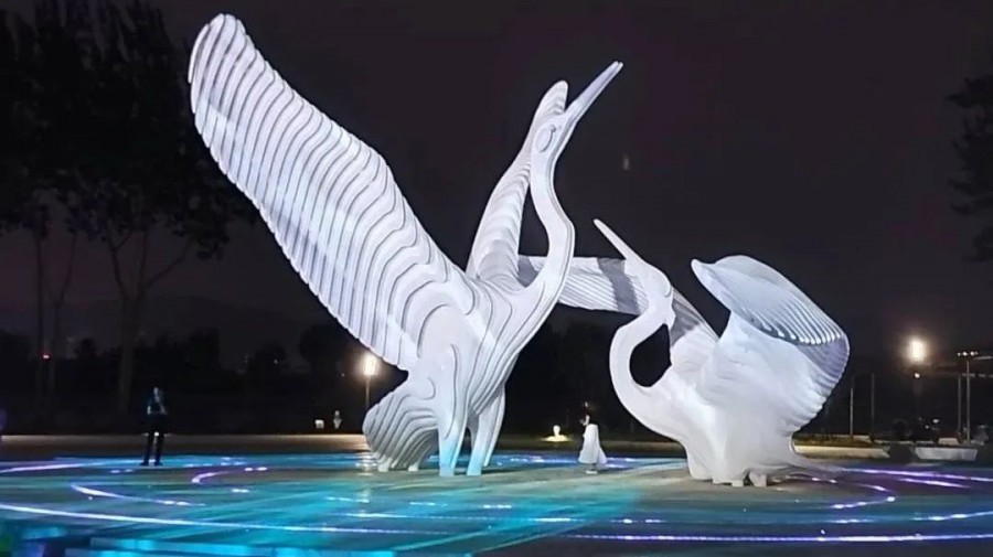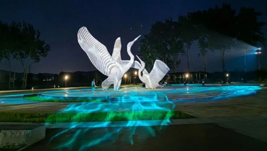 當燈光亮起,如同春風吹起內夾河河面漣漪,與展翅嬉戲的白鷺雕像呈現一動一靜的美好畫面,賦予雕塑動態光影的魅力。
