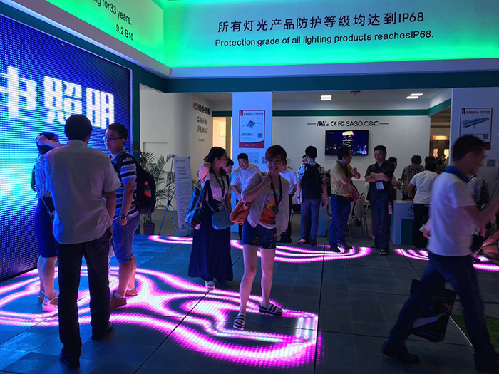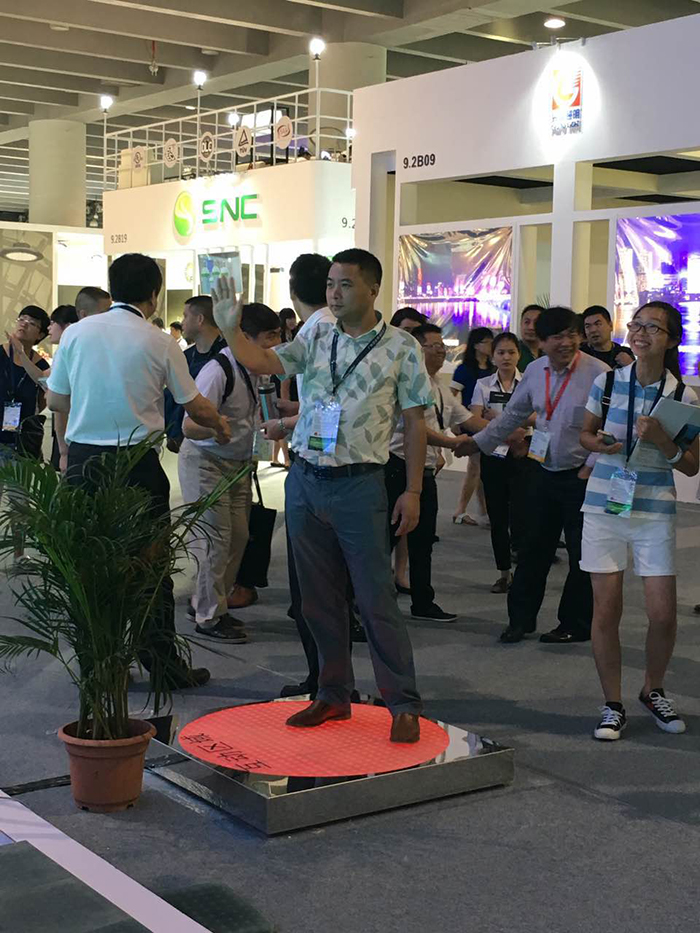 展會上,勇電照明此次推出的“智能化燈光互動控制”技術引起了很多新老客戶的關注,在智能燈光互動體驗區(qū),人們站在探測器前方,通過移動手掌來控制LED屏上動畫的顯示,還可以站在地磚屏上,通過人體的移動來帶動地面燈光的走勢,這種可單人可多人同時參與的新穎互動模式吸引了眾多觀眾前來體驗,使人們更近距離的感受到智能燈光所帶來的科技魅力,成為展會上一大亮點。